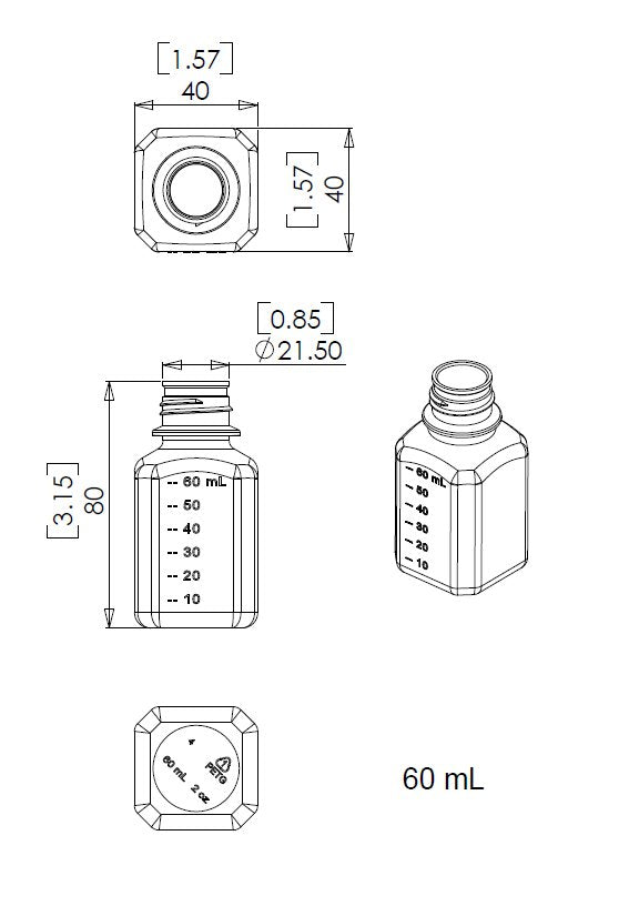 60ml PETG Media Bottle, Standard Cap w/Plastic Shrink Seal, Sterile