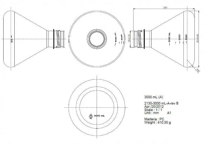 TriForest FPC3000S, 3000ml Polycarbonate Erlenmeyer Culture Flask, Flat Base, Membrane Vented Duo Cap, Sterile