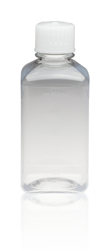 Polyethylene terephthalate bottles with or without high density polyethylene caps in shrink wrapped trays. Lightweight and shatter resistant; recommended for storage of all compatible, solutions, biologicals, liquid culture media and aqueous buffers.